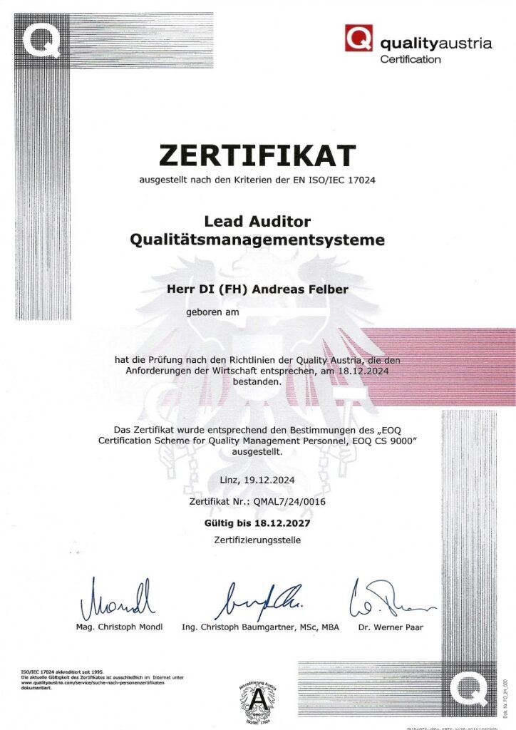 Durch die bestandene Prüfung zum Lead Auditor hat Andreas Felber die Kompetenzen zum Leiten eines Auditteams, zusätzliches Wissen zur Auditierung eines Qualitätsmanagementsystems, mehrwertorientiertem Auditieren, zu speziellen Auditmethoden und zu den Vorgaben der relevanten Akkreditierungsnorm erworben.