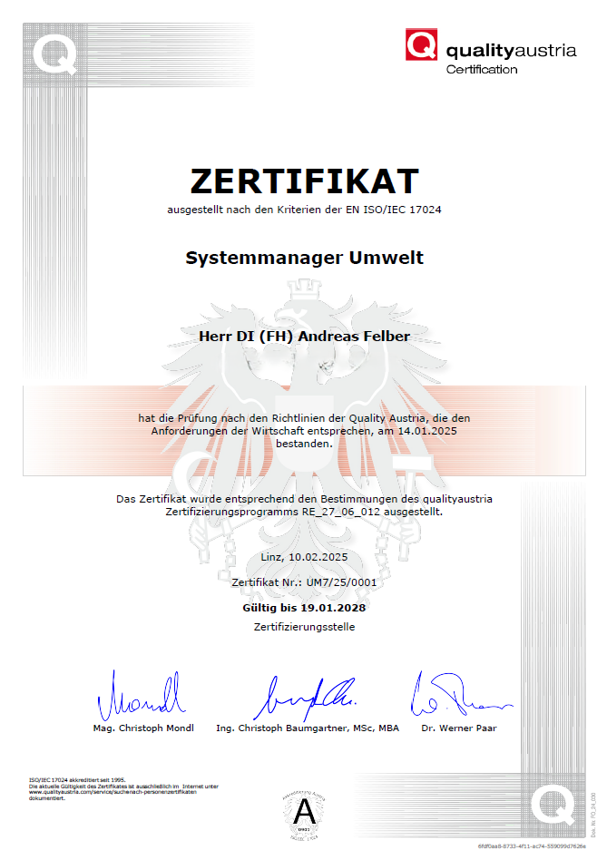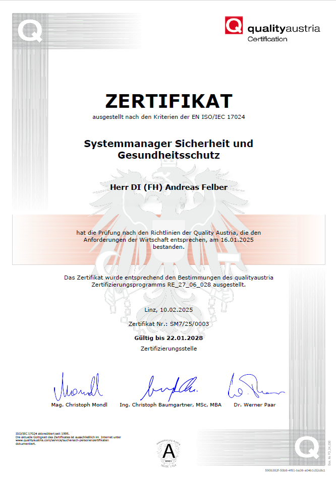 Durch die bestandenen Prüfungen zum Systemmanager Umwelt (ISO 14001) und Systemmanager Sicherheit und Gesundheitsschutz (ISO 45001) hat Andreas Felber die Kompetenzen erworben, Sie beim Umsetzen eines Umweltmanagementsystems und/oder eines Arbeits- und Gesundheitsschutzmanagementsystems zu unterstützen.